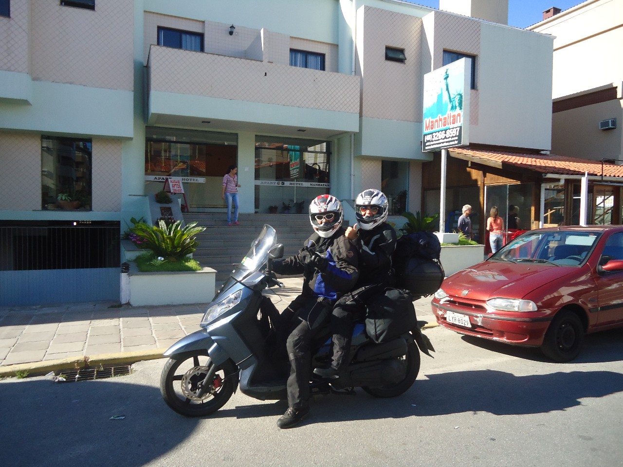 E já a 70 km de Floripa e a 102 km da pousada, eis que tomamos o 3º banho do dia. Tome chuva! Paramos num posto e tomamos um capuccino para elevar o moral que já estava ficando baixo, afinalde contas 833 km num dia é muita coisa! A noite caiu e a chuva dessa vez não parou. Chegamos em Floripa da pior maneira, com chuva, a noite e depois de 12 horas de viagem!!! Mas chegamos. A cidade é muito bem sinalizada, até Canasvieiras não precisei do gps. Agora para a char o hotel, batemos cabeça. Passamos perto dele umas 2 vezes. Mas o cansaço transformava 1 km em 10 km!