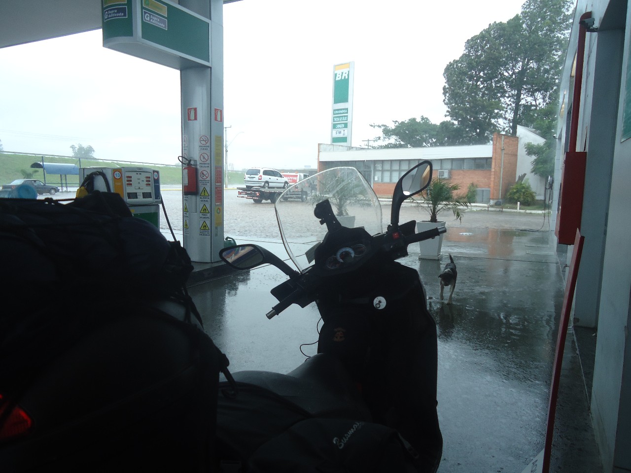 Enfim apareceu um posto. Depois do abastecimento, olhei para a bomba de combustível e couberam 9,2L....CARACA!!!!! Restavam apenas 800 ml...essa foi por pouco. Resolvemos tomar um café no posto, quando o mundo desabou! Muita, mas muita chuva e ventos fortíssimos! Aguardamos no posto por um tempo.